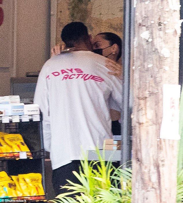 Sweet: No doubt the pair are in the honeymoon phase as the 34-year-old singer couldn’t resist kissing Chanan despite wearing a face mask